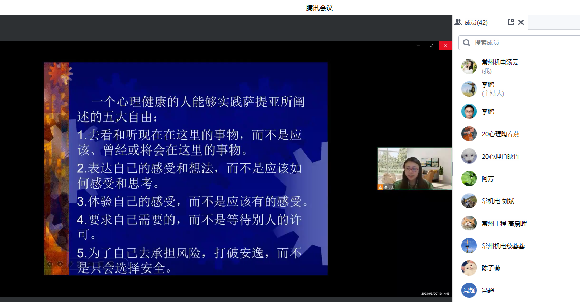 68日上午,由常州市心理健康大专委员会召开的心理健康专题讲座在线上腾讯会议举行。常州机电职业技术学院玲玲老师报告了题为《萨提亚治疗(改变)方法的基本理论》的内容。来自常州各院校42名心理健康教师参与了此次讲座。