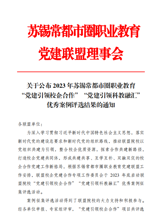 我校获评2023年苏锡常都市圈职业教育“党建引领校企合作”优秀案例一等奖 发布时间:2024-02-29 作者: 访问次数:1092 近日,苏锡常都市圈职业教育党建联盟公布了2023年度职业教育“党建引领校企合作”案例评选结果,我校机关党总支第六党支部报送的《党建引领“五链”耦合,提升政校企合作效能》荣获一等奖。 本次“党建引领校企合作”案例以党组织共建引领为主线,着眼于校企优质资源整合,探索合作共建新路径,打造校企党建共同体,形成共建共享、互学互补、双融双促的校企合作党建工作新格局,共评出一等奖6项、二等奖8项、三等奖12项。 近年来,机关党总支第六党支部坚持将党建与政校企合作同向聚合、深度融合,与服务区域经济高质量发展同向发力、同频共振,先后与南京市高淳区、武进区湖塘镇、泰州市姜堰区等地方政府,江苏恒立、博瑞电力、正昌粮机等企业深入开展党建共建,推进产教融合、科教融汇,打造政校企合作朋友圈,构建产教融合生态圈,提升了产教融合、政校企合作质效。 (供稿:史重庆 编辑:王国顺 审核:刘刚)