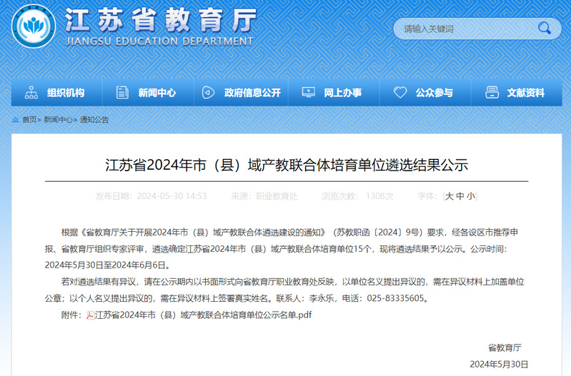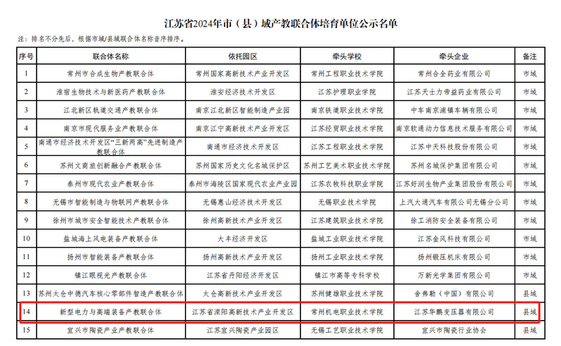 我校获批江苏省市(县)域产教联合体培育单位 发布时间:2024-06-04 作者: 访问次数:1028 近日,江苏省教育厅公布了2024年省级市(县)域产教联合体培育单位名单。我校作为牵头院校,联合溧阳高新技术产业开发区、江苏华鹏变压器有限公司共建的“新型电力与高端装备市域产教联合体”成功入选。 新型电力与高端装备市域产教联合体聚焦溧阳高新技术产业开发区“2+2+X”产业集群,服务动力电池、绿色精品钢2个千亿产业集群和智能电网、智能装备制造2个五百亿产业集群及未来产业布局,创新“项目引领、三层递推”联合体治理模式,精准产科教一体化、中高本一体化、职前职后一体化、产学研训创一体化“四个一体化”举措,打造产教融合体制机制创新、高层次技能培养“两高地”,建设社会技术培训服务、应用技术研发成果转化、创新创业项目孵化“三中心”,深化产教城融合,对接产业建学院、协同园区建基地,精准需求优服务,以产业经济需求为引导培养技术技能型人才,形成教育和产业统筹融合、校企城良性互动的总体发展格局。 学校将以该联合体建设为载体,进一步推进产教资源集聚、整合与共享,立足溧阳高新技术产业开发区,创新打造“半小时产教融合圈”,推动职业教育内涵式高质量发展赋能中国式现代化县域典范。 (供稿:史重庆 编辑:刘正银 审核:刘刚)