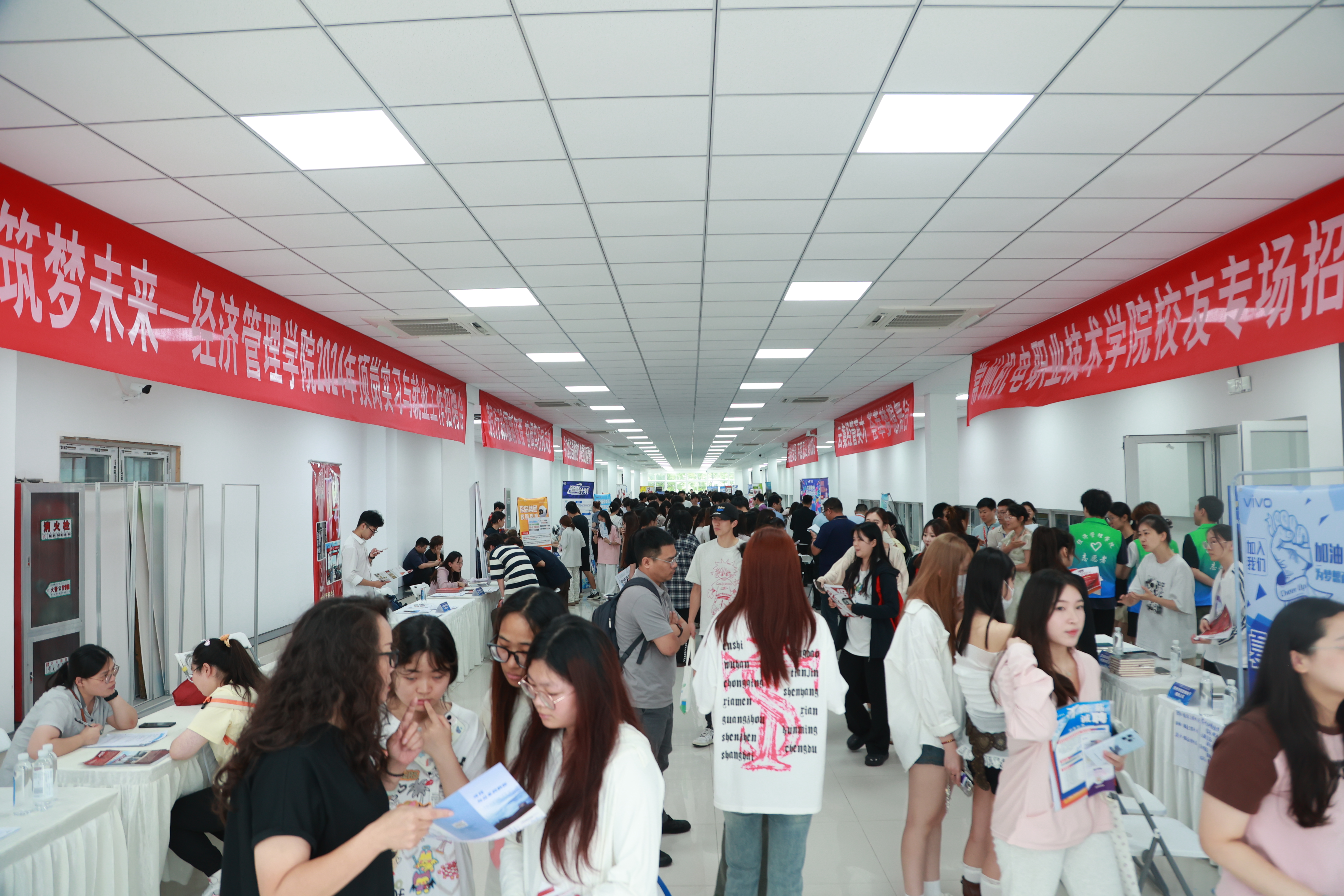 我校经济管理学院举办2024年顶岗实习与就业工作专场招聘会 发布时间:2024-06-27 作者: 访问次数:855 6月26日下午,经济管理学院举办了“厚德崇商、筑梦未来”2024年顶岗实习与就业工作专场招聘会。副校长周庆元,产教合作部部长刘刚,经管学院班子全体成员、辅导员及近600名专业学生参与了此次专场招聘会。 招聘会现场人头攒动、气氛热烈,企业代表们向学生介绍了企业的发展情况、招聘需求以及职位要求,并详细解答了学生们的问题。学生积极递交简历,并与企业代表进行深入交流,展示自己的优势并认真准备面试。周庆元现场与多家企业深入交流,调研企业的人才需求和岗位能力要求,着重了解学生入职后的职业发展通道。同时,他与多个专业的学生进行交流,勉励同学们勇于展示自己的能力和潜力,做好勇挑重担、服务社会的准备。武进区人力资源中心等媒体也莅临现场,进行了现场直播招聘。 本次招聘会共邀请优质企业54家,涉及装备制造业、生产性服务业、新业态服务业等多个行业,覆盖经管学院所有专业,提供了工业品营销、生产物流、跨境电商、轨交运营等就业岗位1500余个。参会企业主要集中在常州及周边地区,包括常州奔牛港务集团、上海国际机场、京东集团、微盟集团、比亚迪、国贸减速机等知名企业以及峰度控股、航锦货代、大国控股旅游等多家校友企业。 近两年来,经济管理学院以党建引领+产教融合的形式,通过一系列“访企拓岗促就业”和企业进校园交流活动等,畅通用人单位与学院之间的对话桥梁;构建了“常青藤”学生职业发展平台,持续整合优质资源,挖掘人才需求,以全方位校企合作为基础,不断培育和创新合作模式,全力推动学生实现更高质量、更充分的就业,助力学校双高建设,为地方经济发展作出新贡献。 (供稿:史蒂雯;编辑:陈翼;审核:于斌)