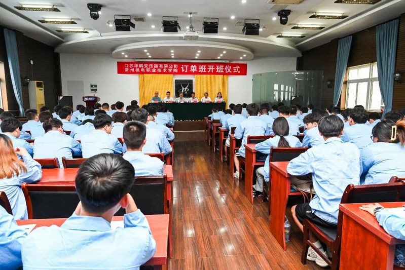 新型电力与高端装备市域联合体举行校企协同育人项目开班仪式 发布时间:2024-09-04 作者: 访问次数:1177 为进一步推进政校企协同育人,探索校企合作“双主体”培养高素质技能型人才的新路径,打造“半小时产教融合圈”。9月2日,新型电力与高端装备市域联合体牵头单位常州机电职业技术学院与江苏华鹏变压器有限公司联合开设的“华鹏现场工程师班”正式开班。溧阳市昆仑街道党工委书记朱旭东、溧阳高新区经济发展局二级主任科员陆福金、江苏华鹏变压器有限公司工会主席张为群、江苏华鹏变压器有限公司人事处处长金华,学校党委副书记朱平、电气工程学院院长蒋庆斌以及现场工程师班的老师学生们参与了开班仪式。开班仪式由金华处长主持。 朱旭东书记高度肯定了本次校企合作在提升人才供给质量、推动产业升级中的重要作用,并寄语双方继续深化合作,共筑产教融合新高地,为溧阳高新区经济社会发展贡献更大力量。 张为群主席对溧阳高新区及学校给予的支持与帮助表示衷心感谢,并承诺公司将全力支持现场工程师班工作,保障培训切实有效,助力学员们提升专业技能与综合素质,成为全能型、创新型的高级技能人才。 朱平副书记对溧阳园区和江苏华鹏变压器有限公司的支持表示感谢,并强调溧阳基地的建设是校企合作的新起点,预示着双方的强强联合。他鼓励学生们抓住华鹏企业发展的新机遇,提升自己的职业技能,为企业发展贡献力量,同时也实现个人的成长和成功。 蒋庆斌院长简要介绍了学院的整体情况,并阐述了本次现场工程师班对于促进学生高质量就业及深化校企合作的重要意义。 学生代表袁茹雪以饱满的热情表达了对未来学习生活的憧憬,承诺将不负重托,勤学苦练,以实际行动回馈校企双方的培育之恩。 本次活动是联合体政校企协同育人重要活动之一。校企双方将通过资源共享、平台共建、项目共研等多种方式促进技能人才培养体系的完善与创新,共同培育更多符合市场需求的高素质技术技能人才,为溧阳高新区经济社会发展注入强劲动力。 (供稿:史重庆 编辑:刘正银 审核:刘刚)