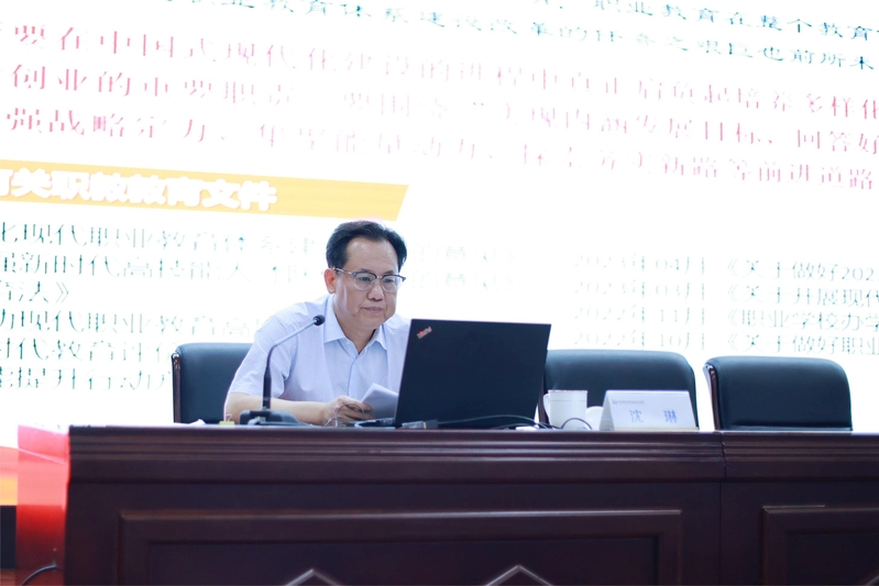 沈琳作题为《准确把握“一融双高”目标任务 谋篇布局学校事业高质量发展》的主题教育专题党课。他以主题教育为主线,以“一融双高”为选题,系统阐释了“一融双高”的内涵、理论逻辑、实践意义和目标要求,“一融双高”是高校党建与业务融合的时代命题,要准确把握“一融双高”的目标任务,发挥全体党员的模范带头作用,冲锋在前,带领全校师生,以党建为引领,谋篇布局学校事业高质量发展。