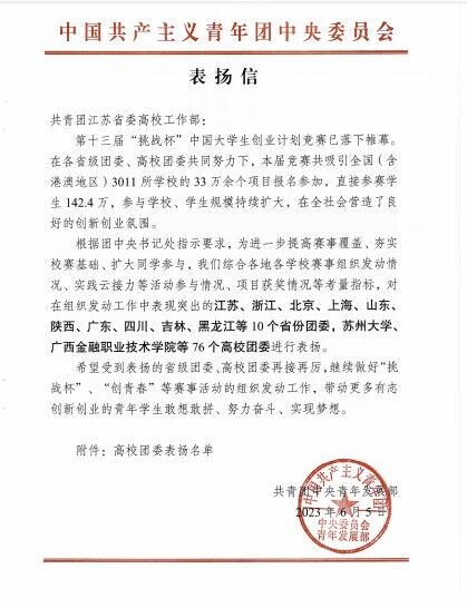近日,团中央对在第十三届“挑战杯”中国大学生创业计划竞赛组织发动工作中表现突出的学校进行表扬,我校相关工作受到团中央充分肯定,获得表扬。江苏省仅6所职业院校获此殊荣。