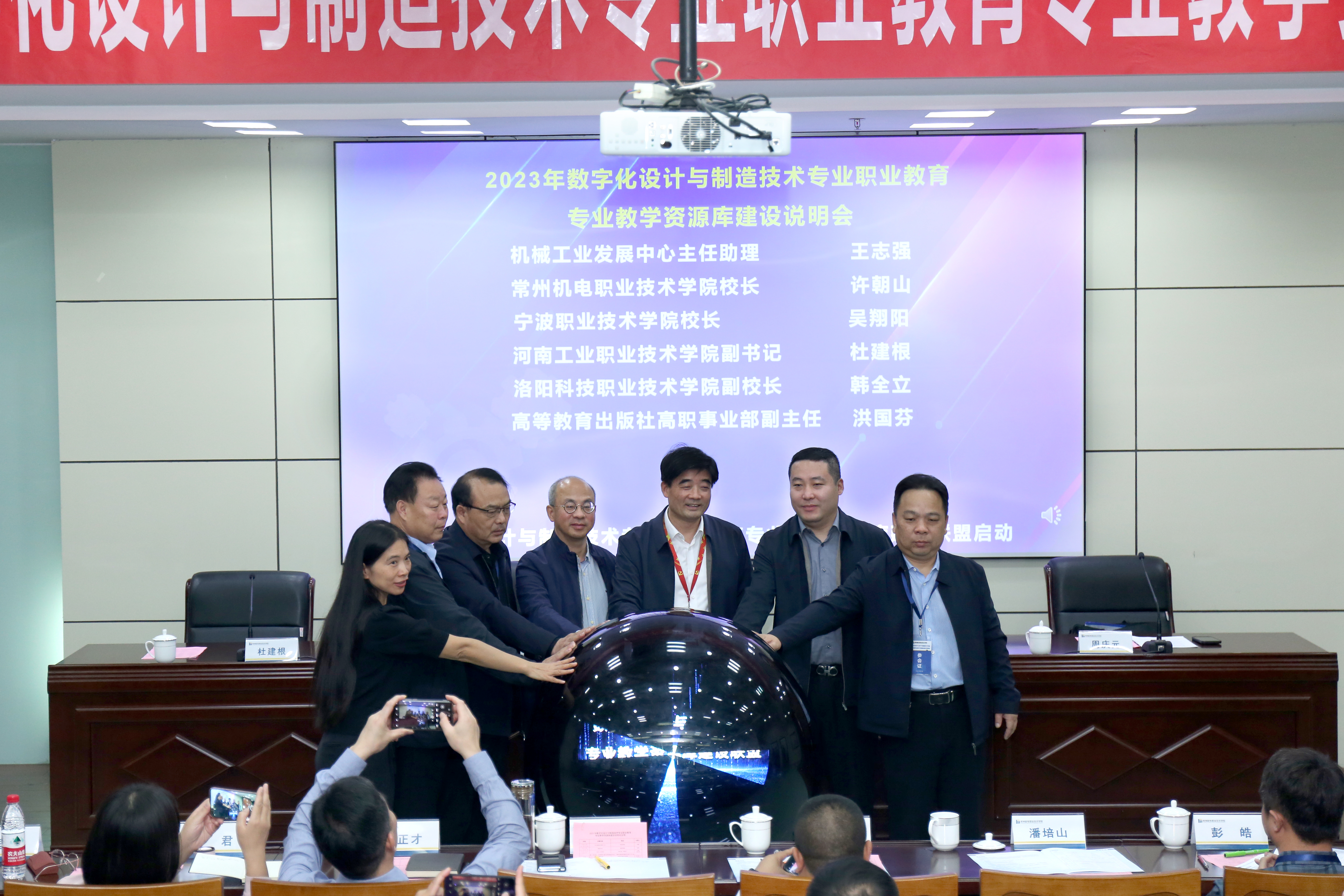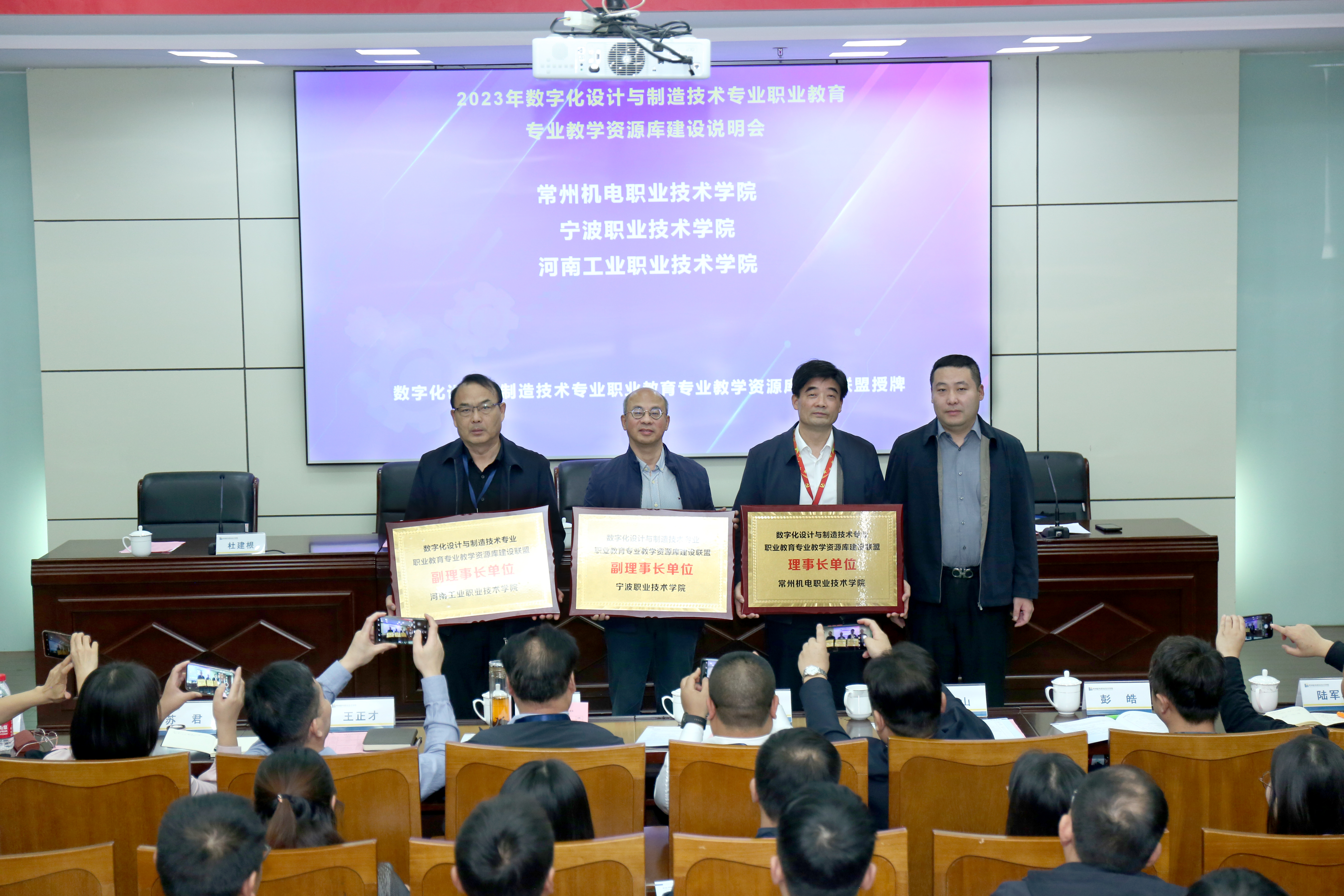 机械工业发展中心主任助理王志强,宁波职业技术学院党委副书记、校长吴翔阳,河南工业职业技术学院党委副书记、副校长杜建根,洛阳科技职业技术学院副校长韩全立等共同启动“数字化设计与制造技术专业职业教育专业教学资源库建设联盟”,并对理事长单位、副理事长单位及成员单位进行授牌。