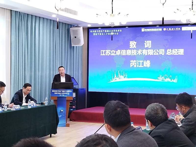 江苏立卓信息技术有限公司总经理芮江峰作为参建单位发言。他表示,共同体建设要积极探索人才贯通培养模式,发挥牵头企业作用,整合产业链上下游资源,协助院校搭建优质育人环境,紧跟产业创新需要,推动职业教育高质量发展。