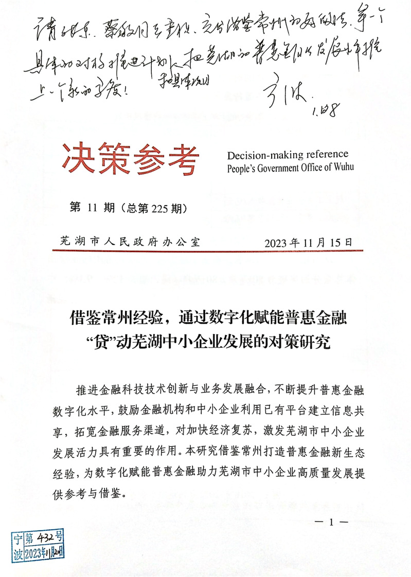 我校江苏高校哲学社会科学重点研究基地—智能制造产业经济研究院科研团队研究成果《借鉴常州经验,通过数字化赋能普惠金融“贷”动芜湖中小企业发展的对策研究》《借鉴苏州、常州经验,疫情后我市外资引进工作机遇和政策研究》分别得到芜湖市委书记宁波、市长徐志批示,两项成果分别被列入2023年第11、12期《决策参考》,报送芜湖市四大班子负责同志,市政府秘书长,市委、市政府副秘书长,并抄送至各县市区政府、开发区管委会,市各有关单位。