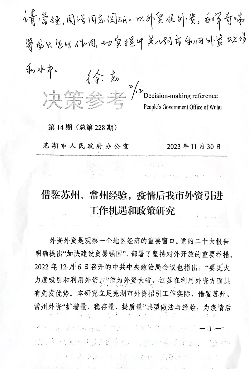 这是继2022年12月团队成果获得市长(现任市委书记宁波)批示后,再次获得芜湖市委、市政府主要领导批示,实现了团队在咨政课题研究方面的新突破。