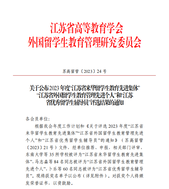 近日,江苏省高等教育学会外国留学生教育管理研究委员会正式发文,我校获评“2023年江苏省来华留学生教育先进集体”。我校已连续四次获此殊荣,另有1名教师获评“江苏省外国留学生教育管理先进个人”,1名教师获评“江苏省优秀留学生辅导员”。