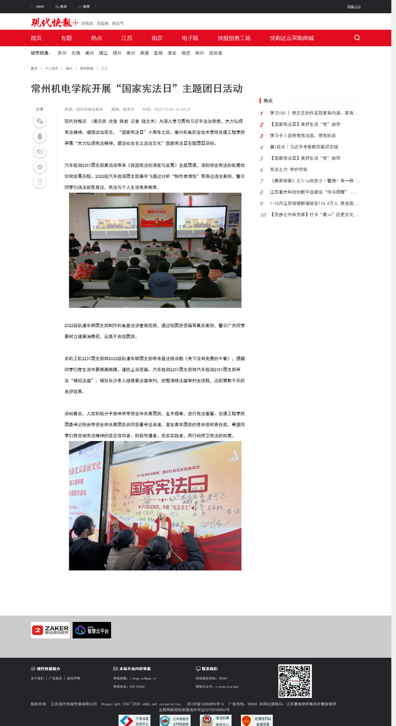 现代快报讯(通讯员沈俊陈云记者陆文杰)为深入学习贯彻习近平法治思想,大力弘扬宪法精神,增强法治观念,“国家宪法日”十周年之际,常州机电职业技术学院交通工程学院开展“大力弘扬宪法精神,建设社会主义法治文化”国家宪法日主题团日活动。