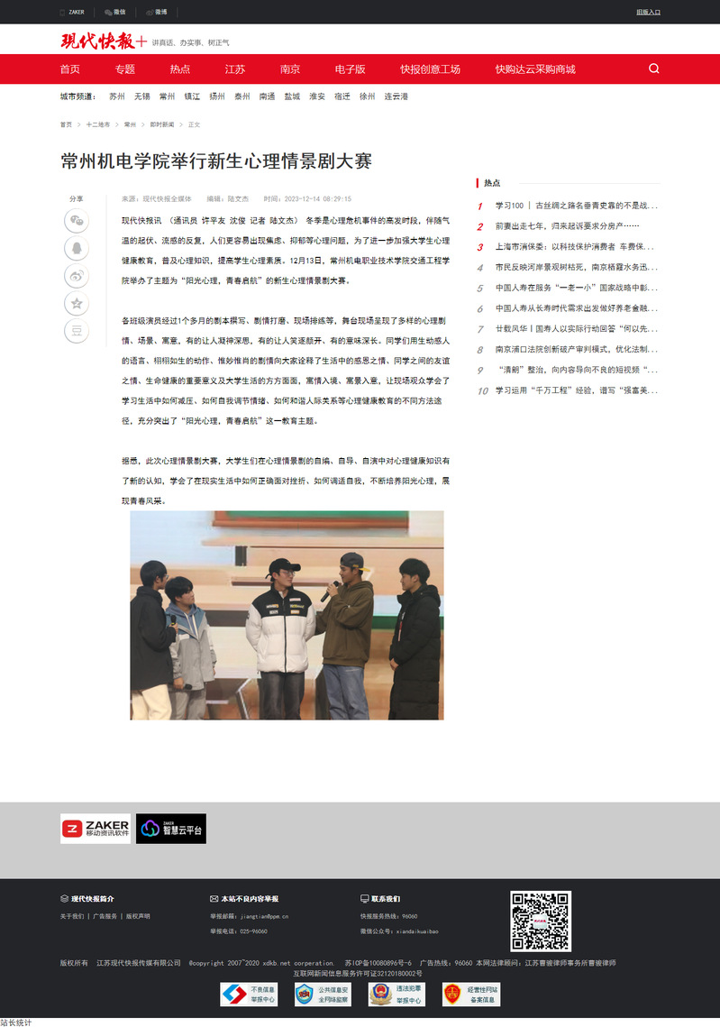 现代快报讯(通讯员许平友沈俊记者陆文杰)冬季是心理危机事件的高发时段,伴随气温的起伏、流感的反复,人们更容易出现焦虑、抑郁等心理问题,为了进一步加强大学生心理健康教育,普及心理知识,提高学生心理素质。12月13日,常州机电职业技术学院交通工程学院举办了主题为“阳光心理,青春启航”的新生心理情景剧大赛。