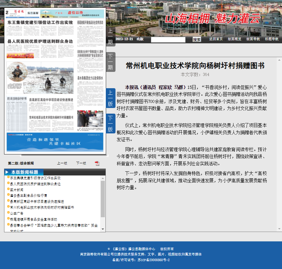 本报讯(通讯员程家欣马群)15日,“书香润乡村,阅读促振兴”爱心图书捐赠仪式在常州机电职业技术学院举行。此次爱心图书捐赠活动向我县杨树圩村捐赠图书700余册,涉及党建、财务、经贸等多个类别,旨在丰富杨树圩村农家书屋图书数量、品类,助力农村精神文明建设,为乡村文化振兴贡献力量。