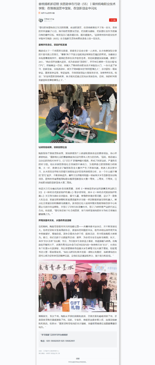 “曾经的我曾抱怨过生活的苦楚,前途的迷茫,但资助政策给予了我一束光,老师的关怀温暖了心田,我开始把苦楚当甘甜,把困难当磨砺,把回馈社会作为发展自我的最终目标,我发现自己越来越自信,越来越强大。”这是常州机电职业技术学院学生陶励(化名)在全院新生资助政策宣讲会上的一段发言。