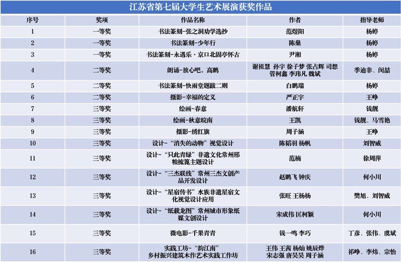 近日,江苏省教育厅公布了全省第七届大学生艺术展演活动评选结果,我校共获各类奖项16项,其中一等奖3项、二等奖3项、三等奖10项,获奖数量为历史最高。