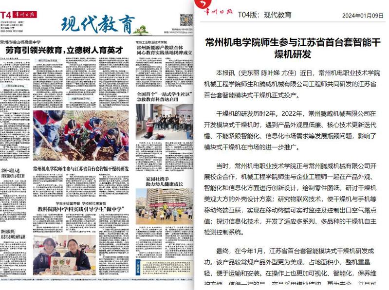 近日,常州机电职业技术学院机械工程学院师生和腾威机械有限公司工程师共同研发的江苏省首台套智能模块式干燥机正式投产。