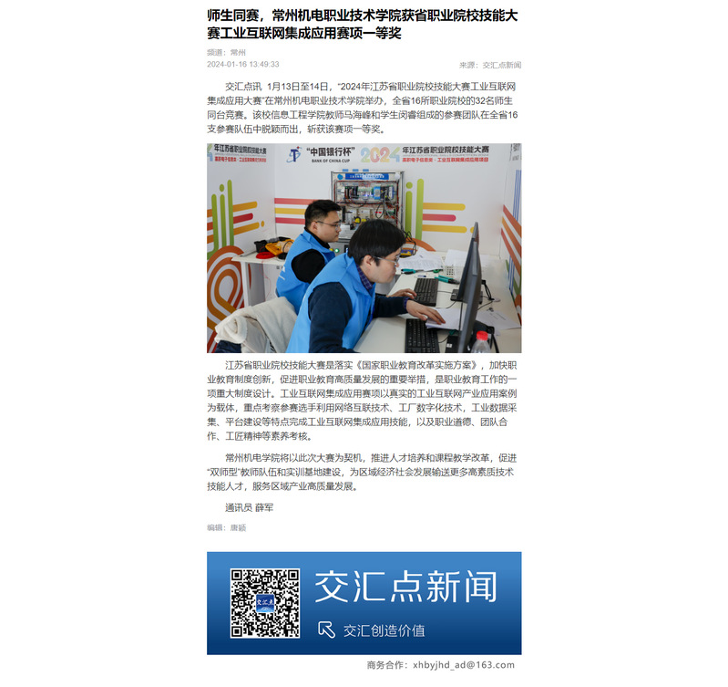 交汇点讯 1月13日至14日,“2024年江苏省职业院校技能大赛工业互联网集成应用大赛”在常州机电职业技术学院举办,全省16所职业院校的32名师生同台竞赛。该校信息工程学院教师马海峰和学生闵睿组成的参赛团队在全省16支参赛队伍中脱颖而出,斩获该赛项一等奖。