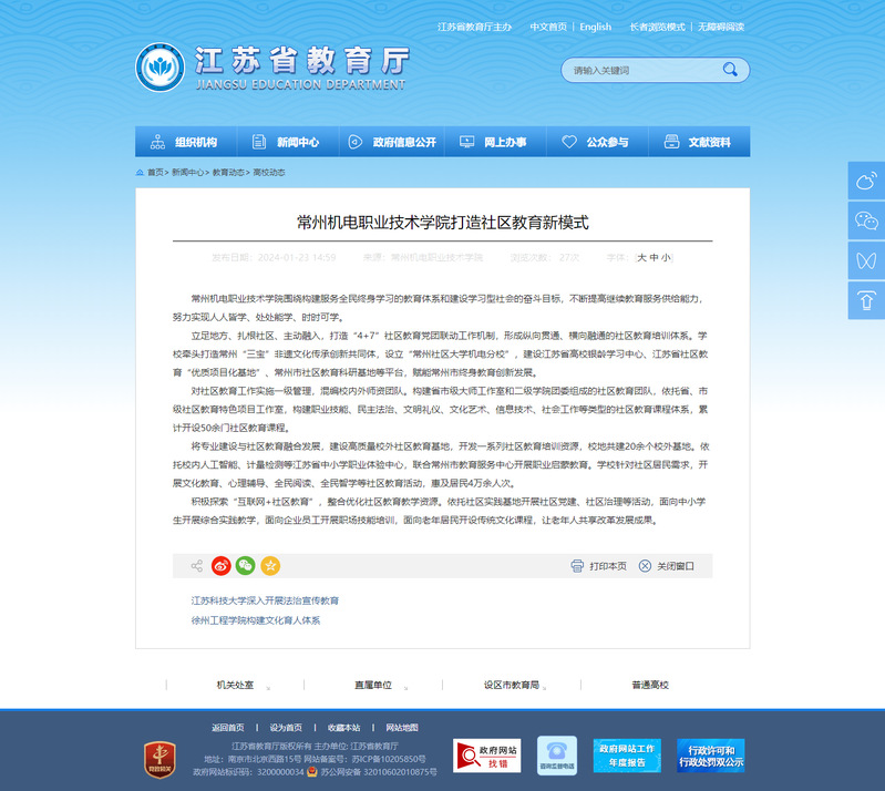立足地方、扎根社区、主动融入,打造“4+7”社区教育党团联动工作机制,形成纵向贯通、横向融通的社区教育培训体系。学校牵头打造常州“三宝”非遗文化传承创新共同体,设立“常州社区大学机电分校”,建设江苏省高校银龄学习中心、江苏省社区教育“优质项目化基地”、常州市社区教育科研基地等平台,赋能常州市终身教育创新发展。