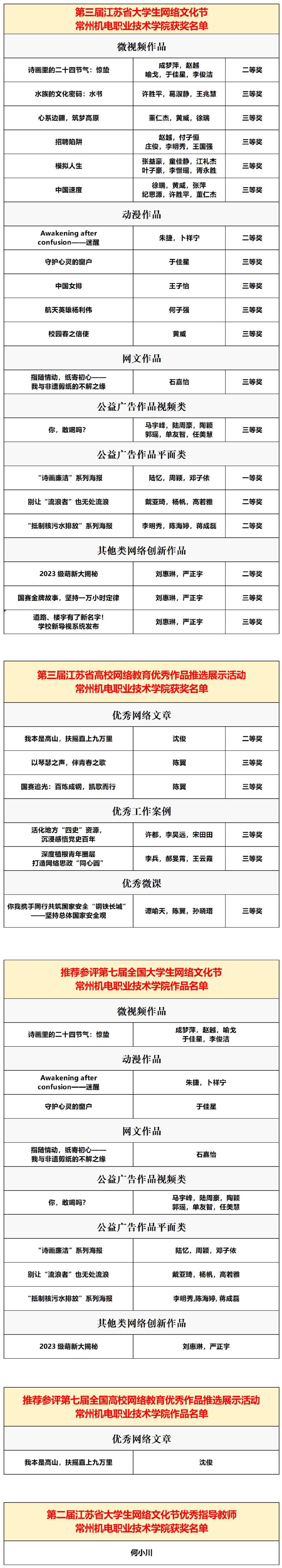 近日,江苏省委教育工委、江苏省教育厅公布了第三届江苏省大学生网络文化节和高校网络教育优秀作品推选展示活动(以下简称“一节一推选”)遴选结果,我校师生作品从全省含本科院校在内的4000余件中脱颖而出,荣获第三届江苏省“一节一推选”活动省级奖项25项,其中一等奖作品1项、二等奖作品6项,三等奖作品18项,获奖总数位居在常高校前列。10项作品被推荐参加教育部遴选。1名教师被授予“第二届江苏省大学生网络文化节优秀指导教师”荣誉称号。