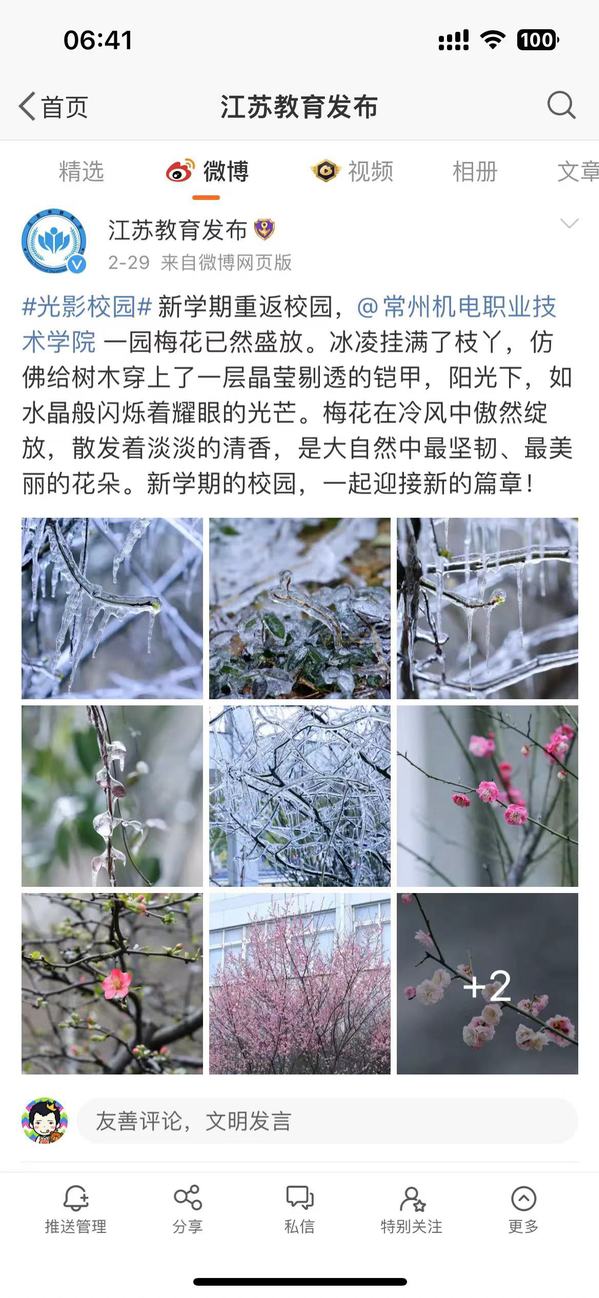 #光影校园#新学期重返校园,@常州机电职业技术学院 一园梅花已然盛放。冰凌挂满了枝丫,仿佛给树木穿上了一层晶莹剔透的铠甲,阳光下,如水晶般闪烁着耀眼的光芒。梅花在冷风中傲然绽放,散发着淡淡的清香,是大自然中最坚韧、最美丽的花朵。新学期的校园,一起迎接新的篇章!