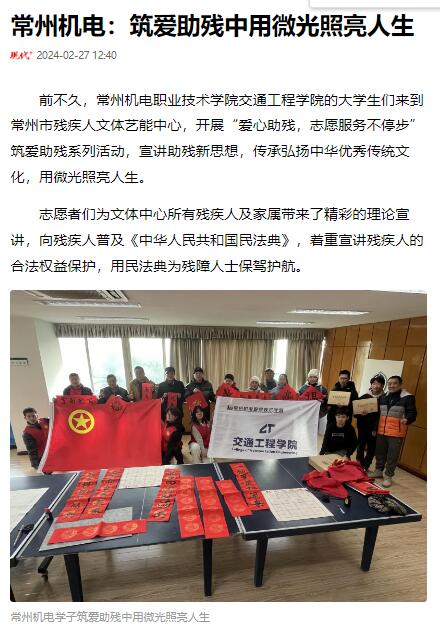 前不久,常州机电职业技术学院交通工程学院的大学生们来到常州市残疾人文体艺能中心,开展“爱心助残,志愿服务不停步”筑爱助残系列活动,宣讲助残新思想,传承弘扬中华优秀传统文化,用微光照亮人生。