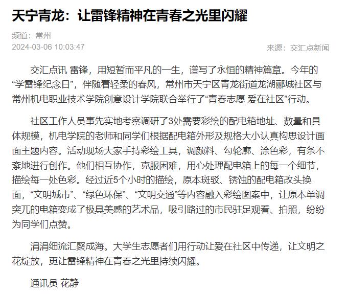交汇点讯雷锋,用短暂而平凡的一生,谱写了永恒的精神篇章。今年的“学雷锋纪念日”,伴随着轻柔的春风,常州市天宁区青龙街道龙湖郦城社区与常州机电职业技术学院创意设计学院联合举行了“青春志愿 爱在社区”行动。
