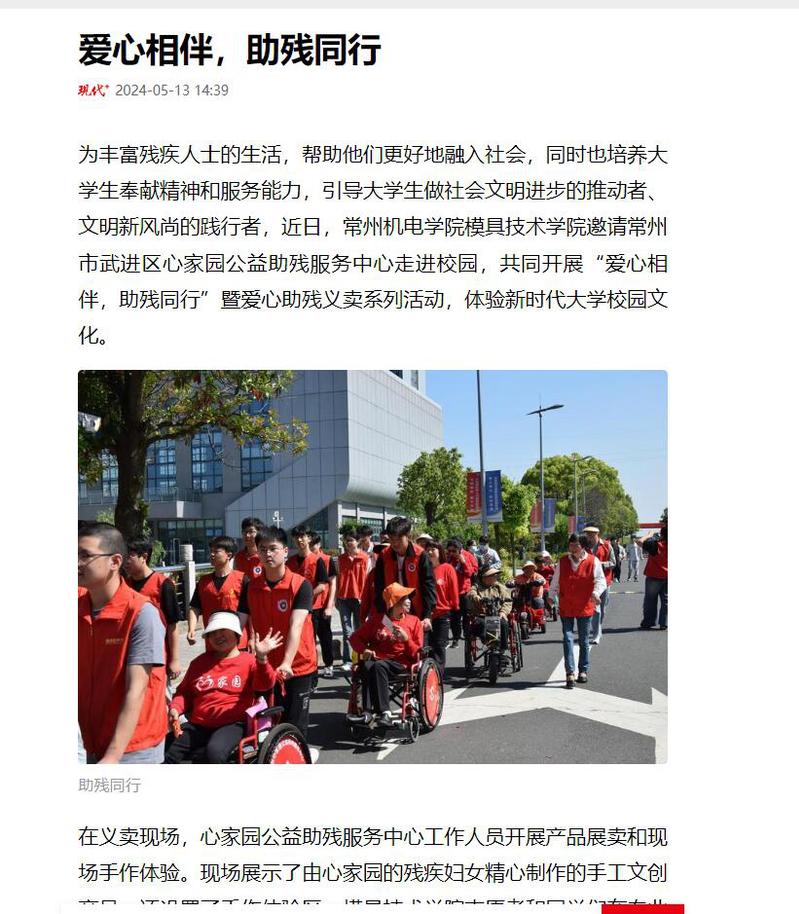 为丰富残疾人士的生活,帮助他们更好地融入社会,同时也培养大学生奉献精神和服务能力,引导大学生做社会文明进步的推动者、文明新风尚的践行者,近日,常州机电学院模具技术学院邀请常州市武进区心家园公益助残服务中心走进校园,共同开展“爱心相伴,助残同行”暨爱心助残义卖系列活动,体验新时代大学校园文化。