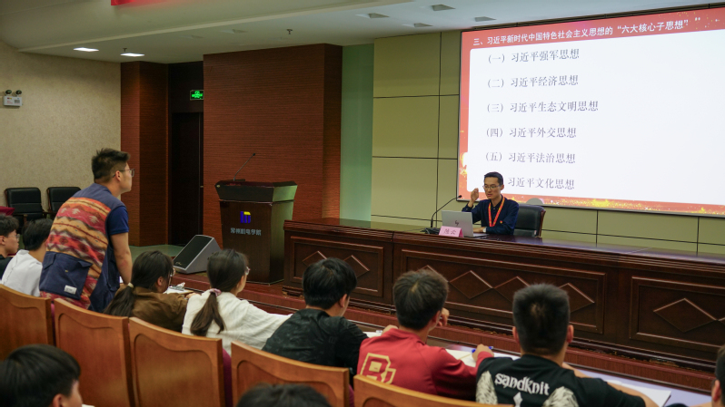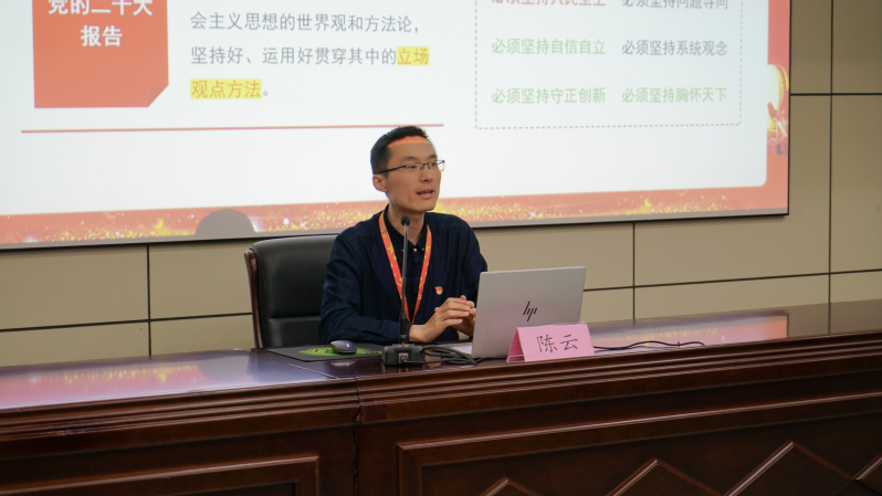 主讲人陈云带领着同学们学习党的二十大报告,回顾了新时代十年我国发展所经历的极不寻常又极不平凡的“三件大事”“三个历史性胜利”。他通过“六个必须坚持”引导学生进行自我反思,并通过事例向同学们讲述如何运用“七个思维”,扩宽同学们知识面,引导同学们认识到“只有用普遍联系的、全面系统的、发展变化的观点观察事物,才能够把握事物发展规律”,引起了现场很多同学的强烈共鸣。