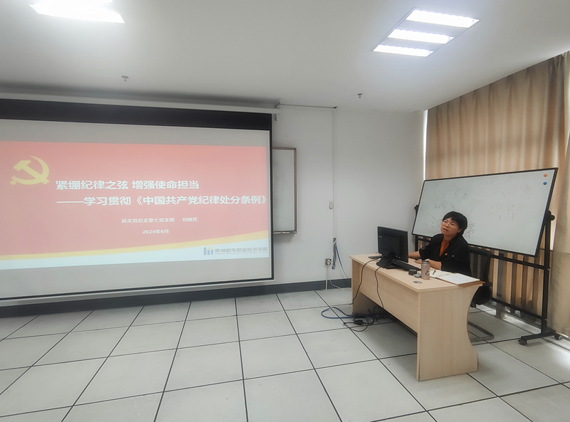 为进一步学习贯彻《中国共产党纪律处分条例》(以下简称《条例》),增强支部全体党员践行政治自觉、思想自觉和行动自觉的意识,6月6日上午,机关党总支第七党支部在图文楼611开展了专题讲座。机关党总支第七党支部书记刘娟芳为支部全体党员解读新修订的《条例》。