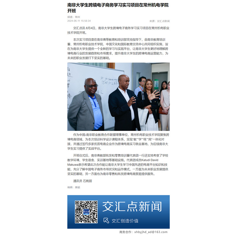 交汇点讯6月4日,南非大学生跨境电子商务学习实习项目在常州机电职业技术学院开班。