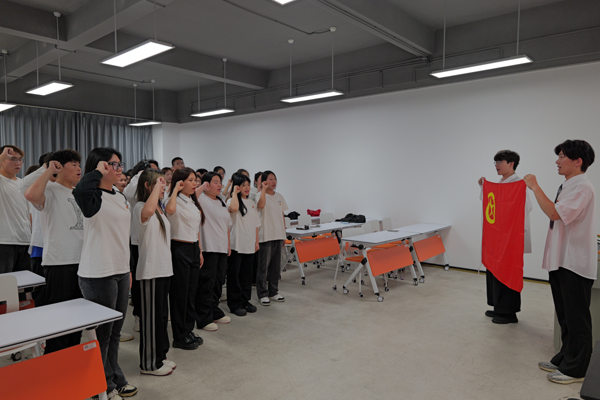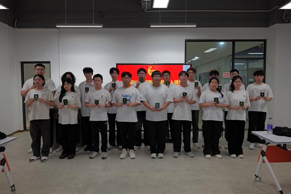 学院分团委书记吴小磊为全体新发展团员佩戴团徽并颁发团员证书。新发展团员进行集体宣誓,彰显了新时代青年奋发向上的精神面貌和昂扬斗志。