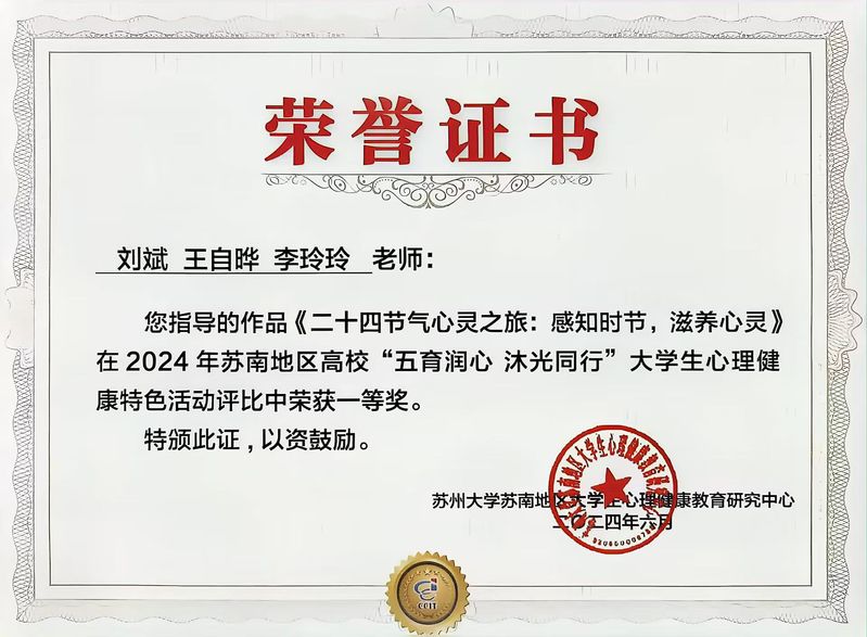 6月13日,苏南地区高校大学生心理健康教育特色工作交流会在常举办,来自苏南地区的27所高校参加了此次活动。我校机械工程学院报送的案例《二十四节气心灵之旅:感恩时节,滋养心灵》(指导老师:刘斌、王自晔、李玲玲)获苏南地区高校“五育润心 沐光同行”大学生心理健康特色活动一等奖,并受邀进行大会交流。