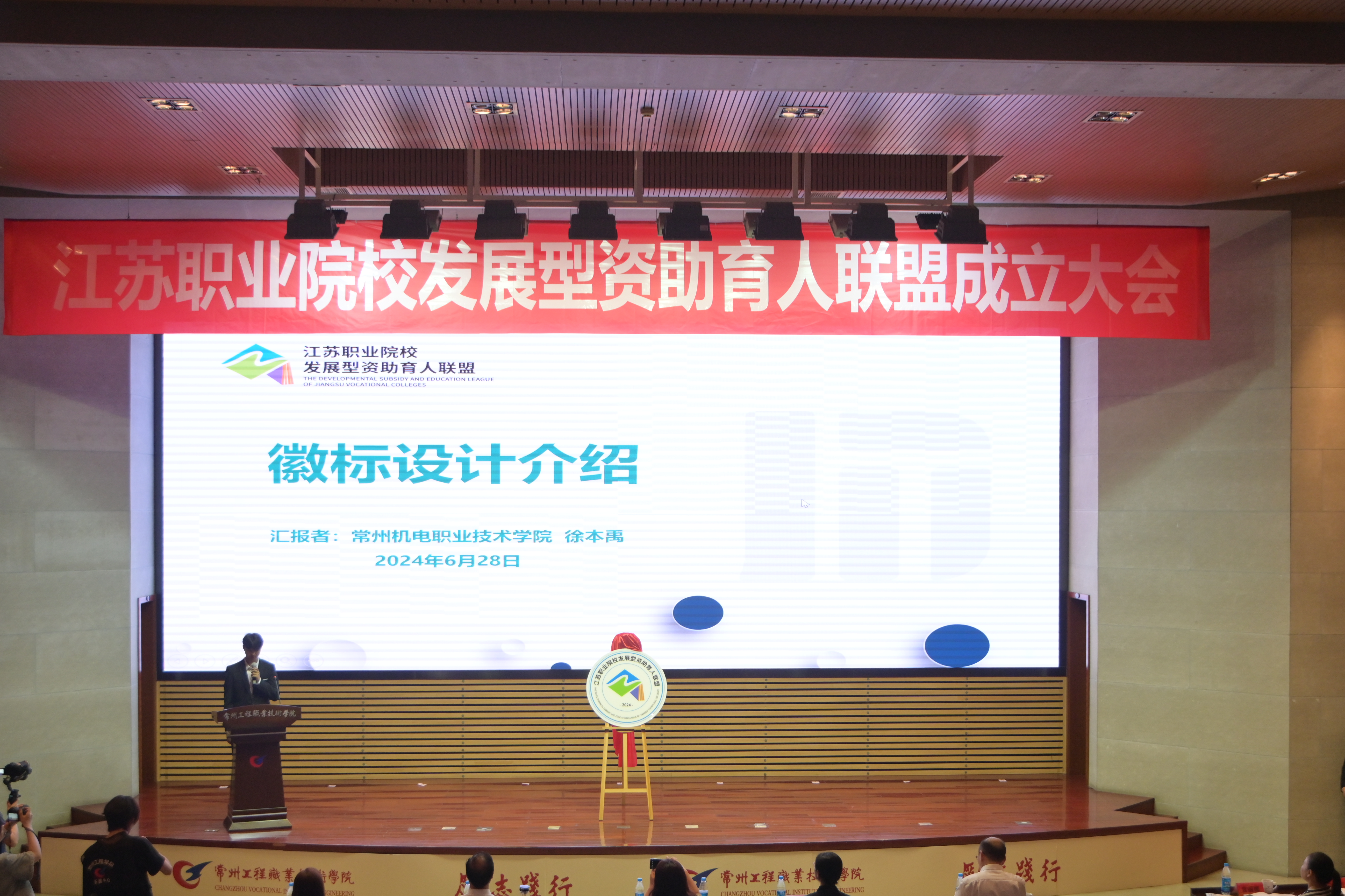 刘娟芳和我校创意学院学生徐本禹一起揭晓联盟徽标发布。联盟徽标由我校创意设计学院视觉2231班学生徐本禹创作设计,他巧妙地融入了“促进发展、育人成才”的核心理念,现场为与会者介绍了徽标设计的思路与应用,同时作为受助学生表达了对国家资助的感谢。