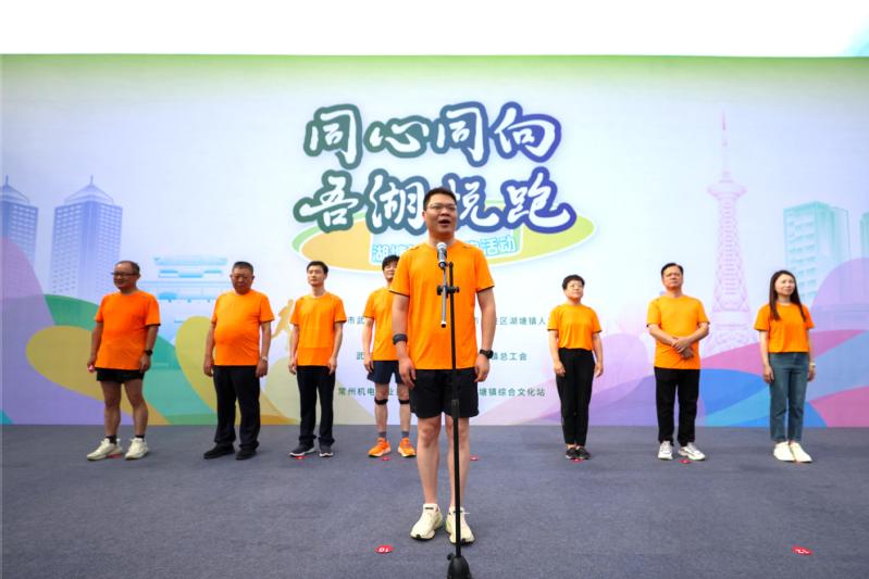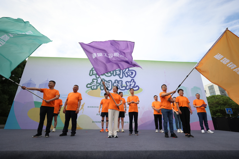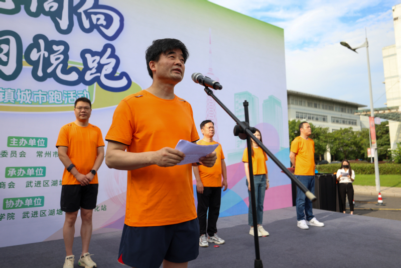 武进区工商联副主席莫珺、常州市科教城管委会建设管理处副处长陈坚强、湖塘镇商会会长余克分别为工会职工跑团、商会跑团、共建单位跑团授旗。