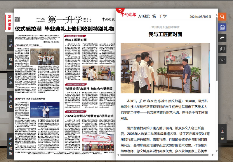 本报讯(许愿 程家欣 陈基伟 图文报道) 假期里,常州机电职业技术学院经济管理学院的学生们走进常州市工艺美术大师示范工作室——徐文博留青竹刻艺术馆,在行走中与工匠面对面。