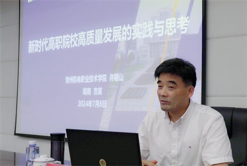 签约仪式结束后,许朝山围绕推进产教科深度融合、高职院校高质量发展作专题讲座。他以《新时代高职院校高质量发展的实践与思考》为题,立足职业教育服务国家发展战略,深刻分析了我校以“双高校建设”为重要着力点,致力于构建产教科深度融合的全新模式、探索数字化转型的崭新道路、发掘并激发新的发展动力的经验做法。在《打造人工智能先进制造现代产业学院,推进产教科协同融合》讲座中,他以我校人工智能与先进制造产业学院建设探索为例,阐述了现代产业学院建设推进产教科融合的思考与总结。讲座既有精准的政策解读,又有详实的案例分享和讲解分析,受到了与会领导、教师的一致认可。