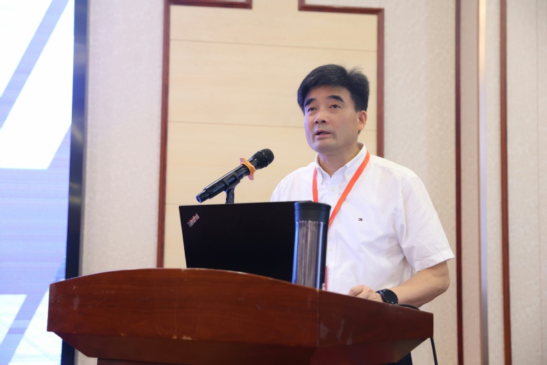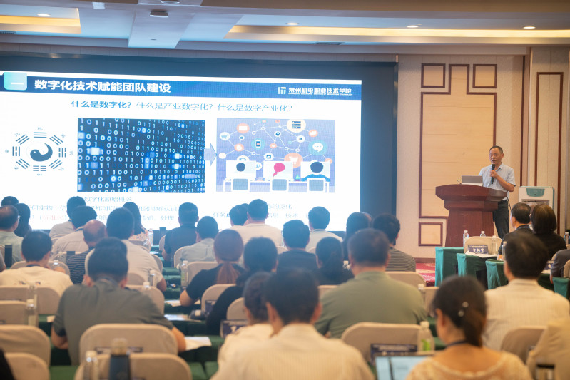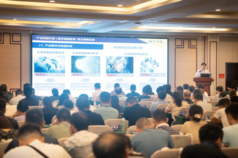 许朝山作题为《高质量发展背景下专业数字化转型的探索与实践》的主旨报告。他在报告中对产业转型升级、数字赋能教育、专业探索实践三个方面进行了详细阐述;重点从优化专业建设目标、打造产教深度融合育人平台、完善数字化课程体系、建设数字化教学资源、构建数字化实训体系、培养数字化教学团队、设计数字化评价体系,对我校的专业转型升级思路和举措进行了全面介绍。