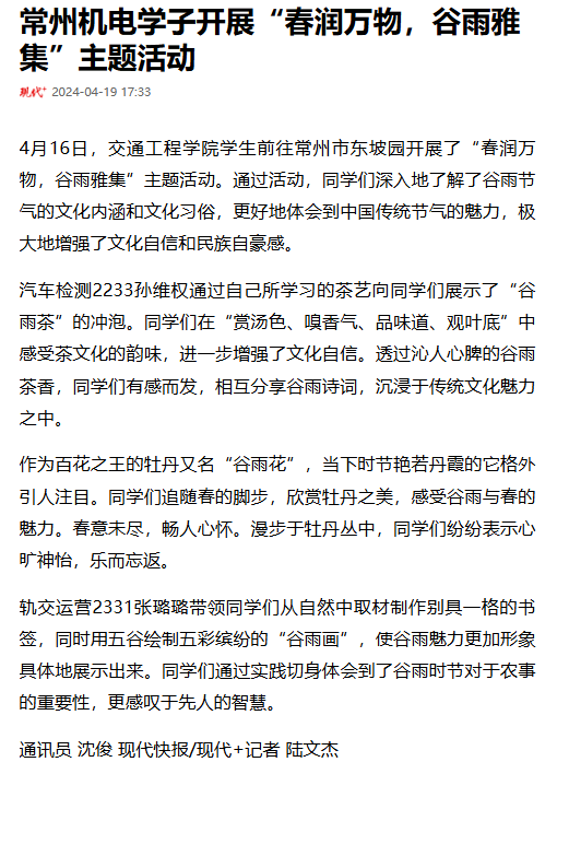 4月16日,交通工程学院学生前往常州市东坡园开展了“春润万物,谷雨雅集”主题活动。通过活动,同学们深入地了解了谷雨节气的文化内涵和文化习俗,更好地体会到中国传统节气的魅力,极大地增强了文化自信和民族自豪感。