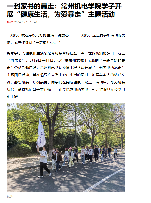 离家学子的健康和生活总是令母亲牵肠挂肚,当“世界防治肥胖日”遇上“母亲节”,5月9日—11日,受火爆常州龙城十余载的“一袋牛奶的暴走”公益活动启发,常州机电学院交通工程学院开展“一封家书的暴走”主题团日活动,旨在倡导广大学生健康生活的同时,加强与家人的情感交流,感恩母亲,珍视亲情。同学们在完成健康“暴走”活动后,可为母亲赢得一份特殊的母亲节礼物——由学院寄出的家书一封,汇报其在校学习和生活。