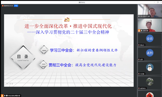 8月13日下午,民建常州机电学院支部开展线上学习活动,活动主题为“进一步全面深化改革·推进中国式现代化——深入学习贯彻党的二十届三中全会精神”。在支部主委许西惠带领下,支部会员及会友共18名老师参加了学习。