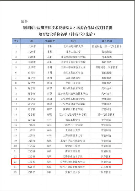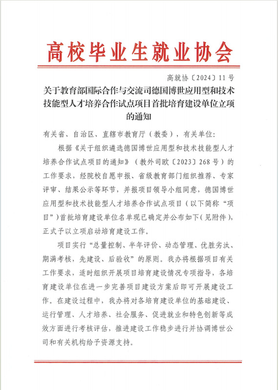 近日,高校毕业生就业协会发布《关于教育部国际合作与交流司德国博世应用型和技术技能型人才培养合作试点项目首批培育建设单位立项的通知》,我校成功入选首批培育建设单位,建设方向为“智能制造”。