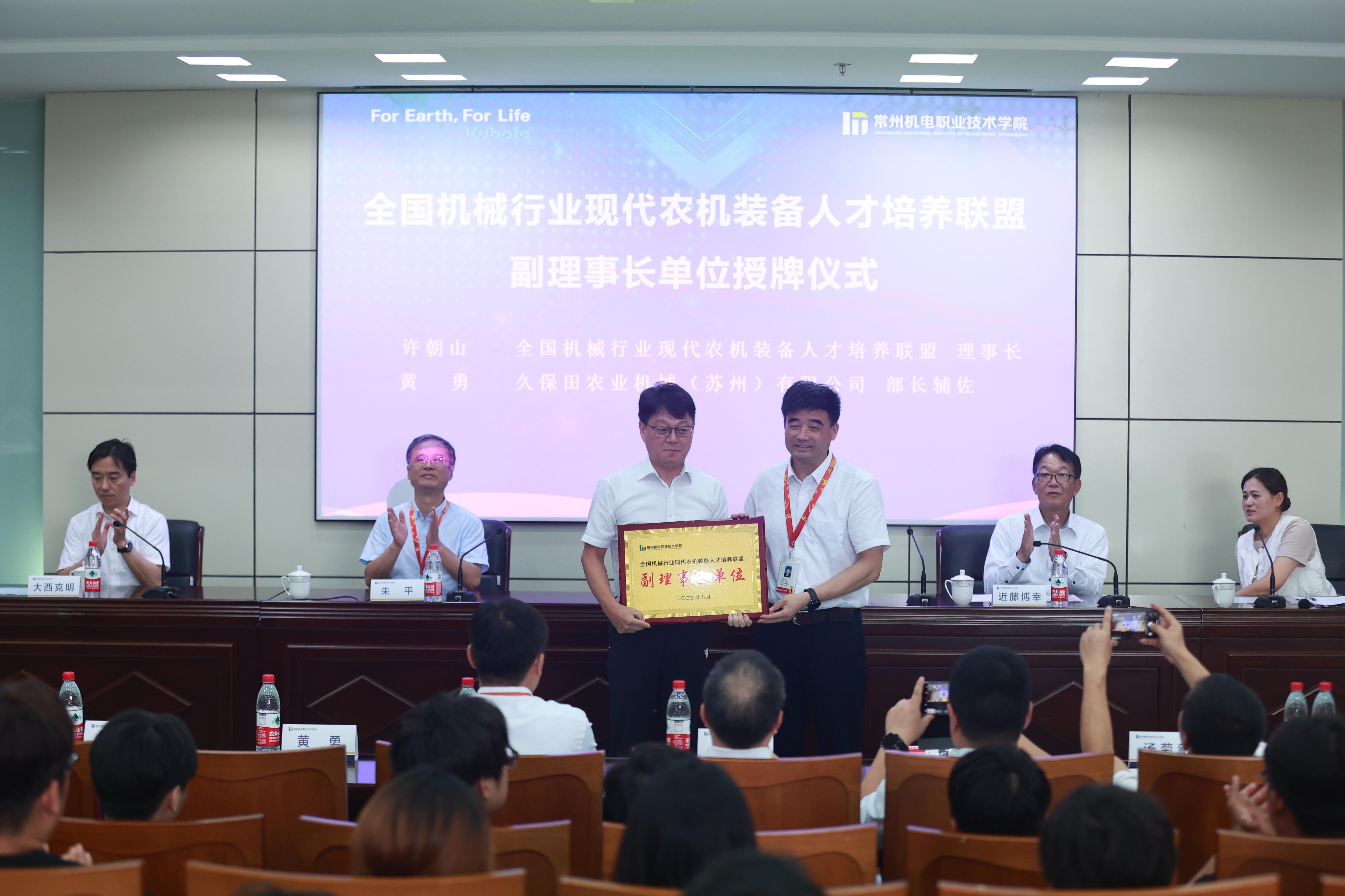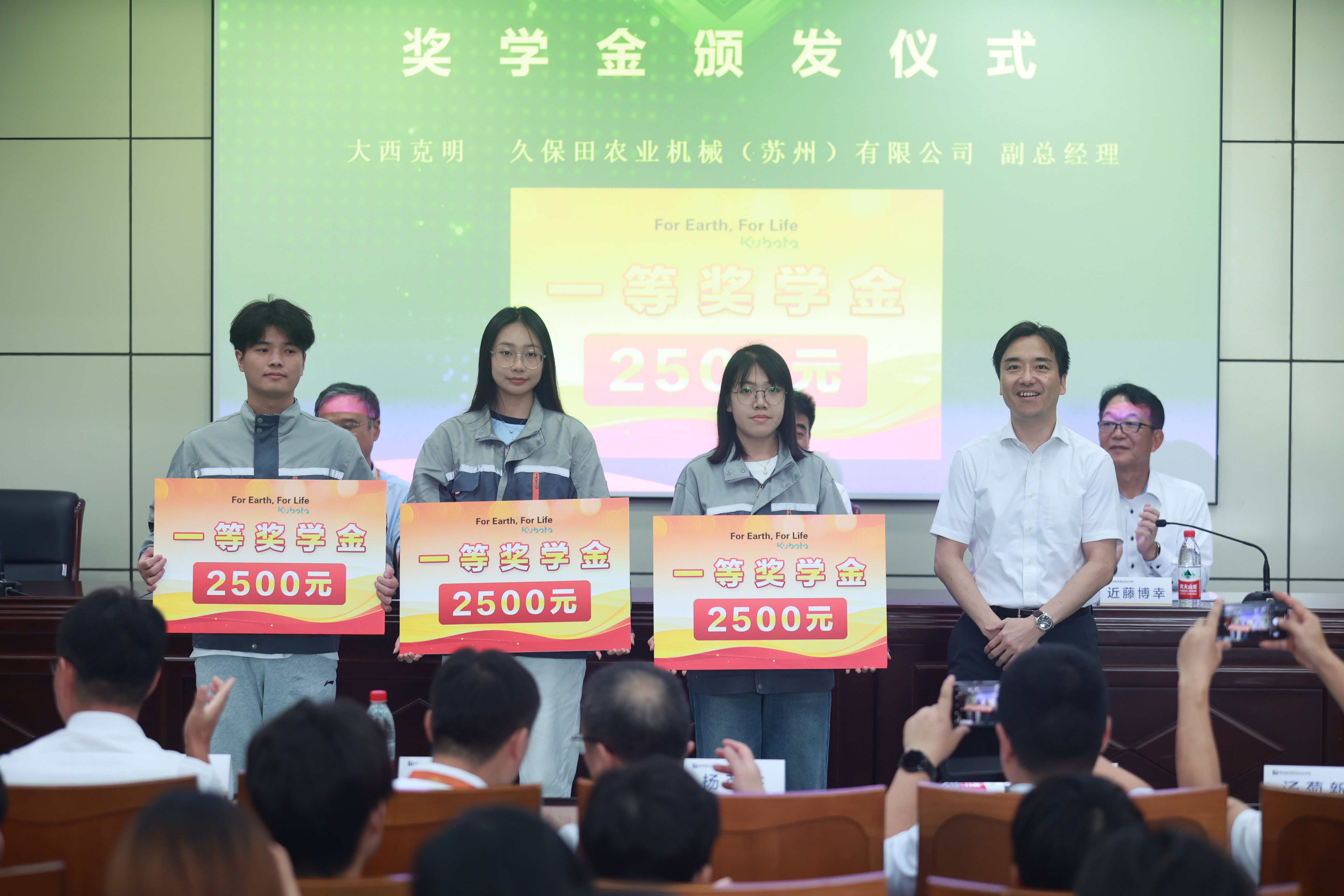 仪式上,许朝山为久保田农业机械(苏州)有限公司颁发“全国机械行业现代农机人才培养联盟副理事长单位”牌。朱平与大西克明共同签署了校企合作培养技术人才协议。校企双方领导共同为“久保田订单班”揭牌,为久保田订单班学生颁发奖学金。