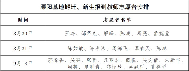 在溧阳搬迁和迎新期间,为全方位保障搬迁工作、迎新工作的顺利进行,充分发挥党员的模范带头作用,我校组织一支由党员教师组成的志愿者“先锋队”,顶着炎炎烈日,以温馨贴心的服务,为学生搬迁、新生入学筑起坚实的保障。