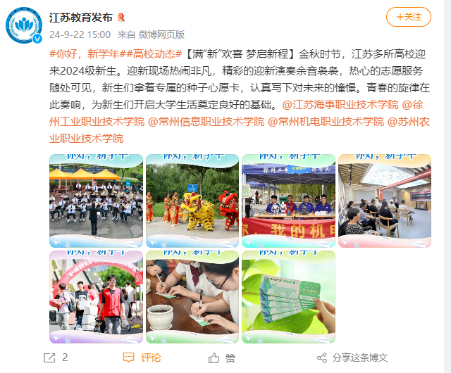 金秋时节,江苏多所高校迎来2024级新生。迎新现场热闹非凡,精彩的迎新演奏余音袅袅,热心的志愿服务随处可见,新生们拿着专属的种子心愿卡,认真写下对未来的憧憬。青春的旋律在此奏响,为新生们开启大学生活奠定良好的基础。