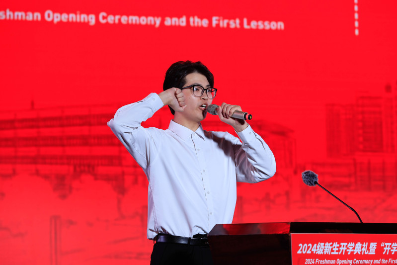 在宣誓环节,经济管理学院新生谢楠鑫领誓,全体新生共同宣誓,立志用奋斗成就梦想,用行动铸就未来。
