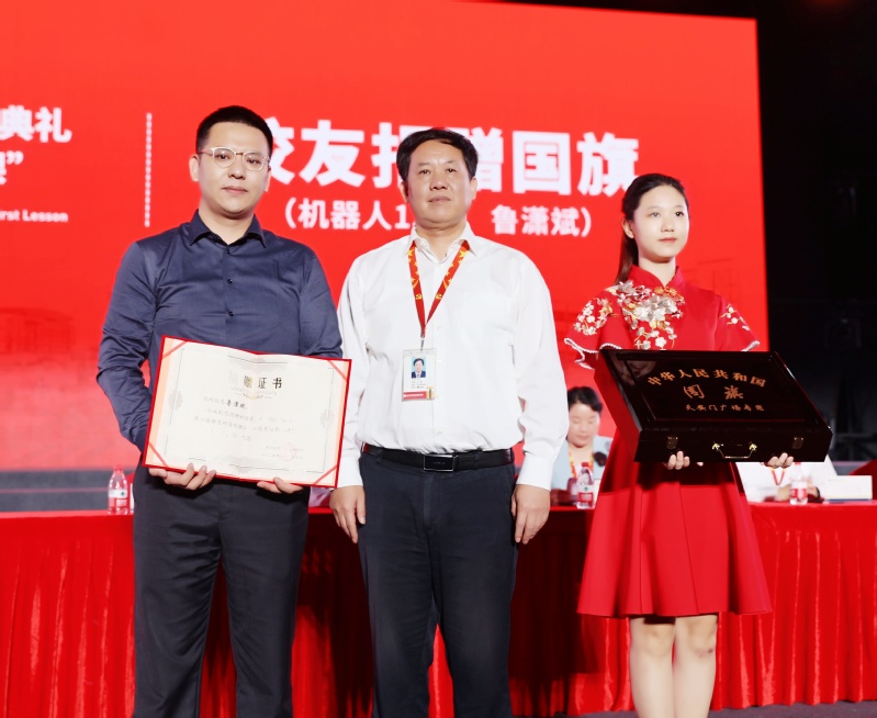 电气工程学院工业机器人专业2016届毕业生鲁潇斌向母校捐赠国旗和三军仪仗指挥刀,沈琳为其颁发捐赠证书。这面国旗在我校60周年校庆日当天于天安门广场冉冉升起,见证了祖国的繁荣昌盛,承载着校友对母校的深情厚谊。