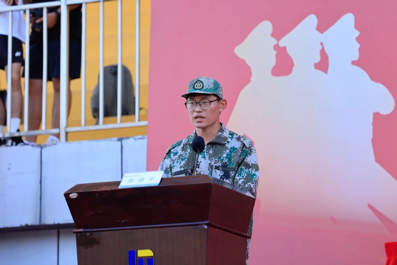 新生代表李帅彤发言。他回忆了这段特殊而难忘的经历,军训让同学们感受到军人的庄重,学会了自律和坚持、协作和信任。