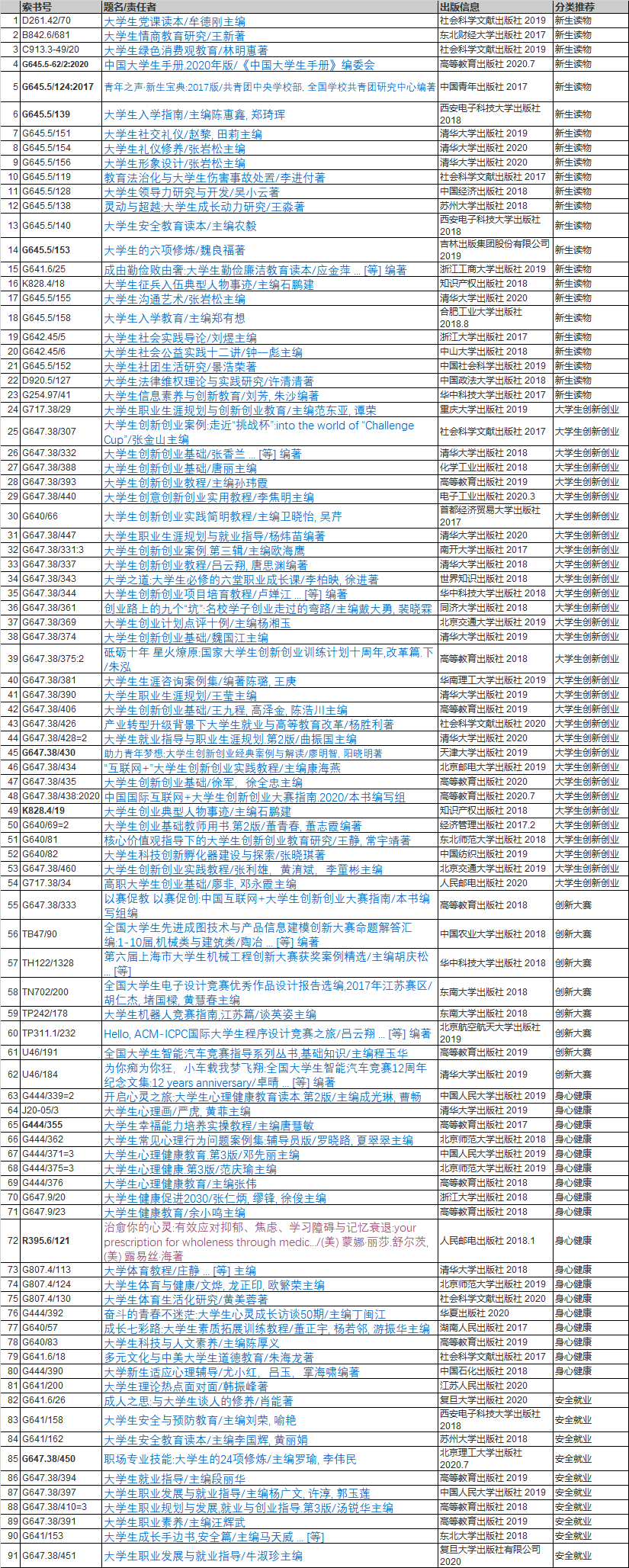 校图书馆欢迎广大新生和在校生关注这些领域,前来参观翻阅、借阅,更快更广地了解、规划和充实大学生活。