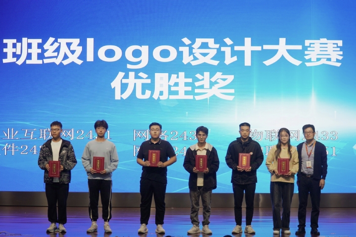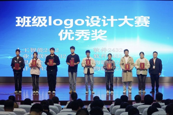学生会学习部部长石天悦展示班级logo设计大赛部分优秀作品,学院领导为获优胜奖和优秀奖班级颁奖。
