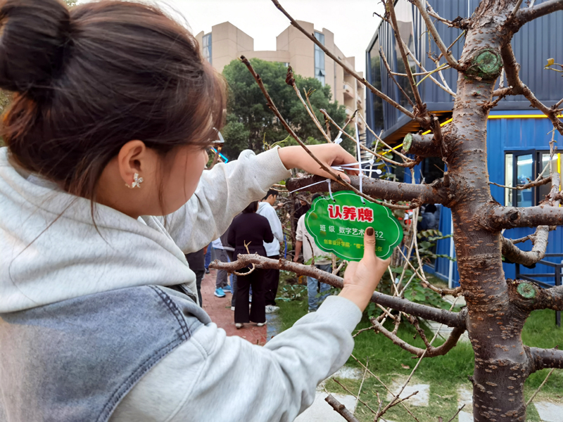 创意设计学院院长康晨向捐赠方江苏新享网络科技有限公司总经理邱卫颁发捐赠证书,表达对企业支持教育、共筑绿色生态校园的深深谢意。学院党总支书记顾兴华为2024级各班级颁发“班级果树认养牌”,标志着同学们正式成为这些果树的“小园丁”,承担起养护责任。