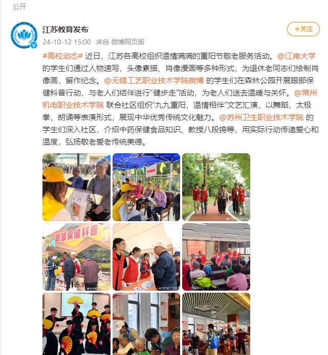 #高校动态# 近日,江苏各高校组织温情满满的重阳节敬老服务活动。@常州机电职业技术学院 联合社区组织“九九重阳,温情相伴”文艺汇演,以舞蹈、太极拳、朗诵等表演形式,展现中华优秀传统文化魅力。