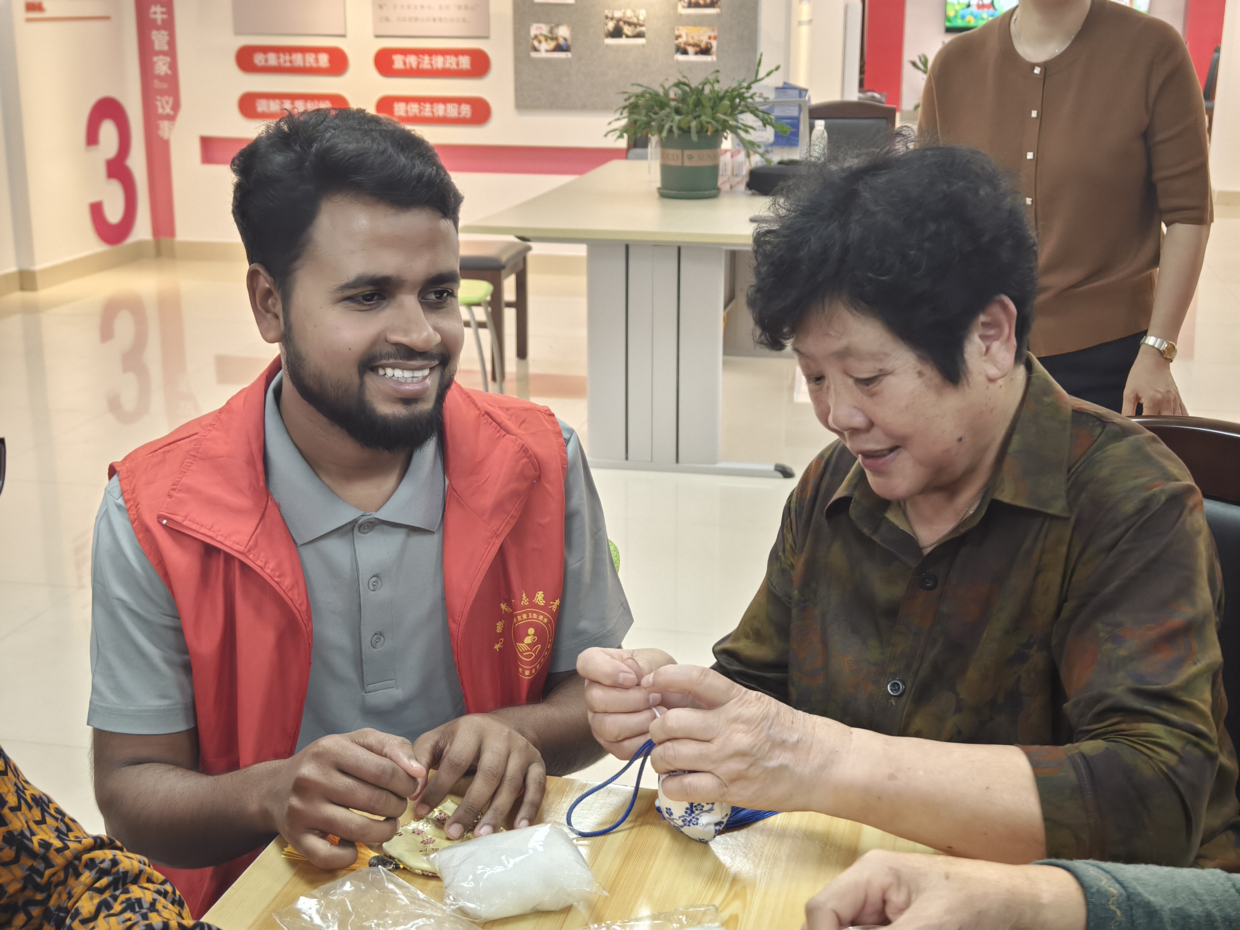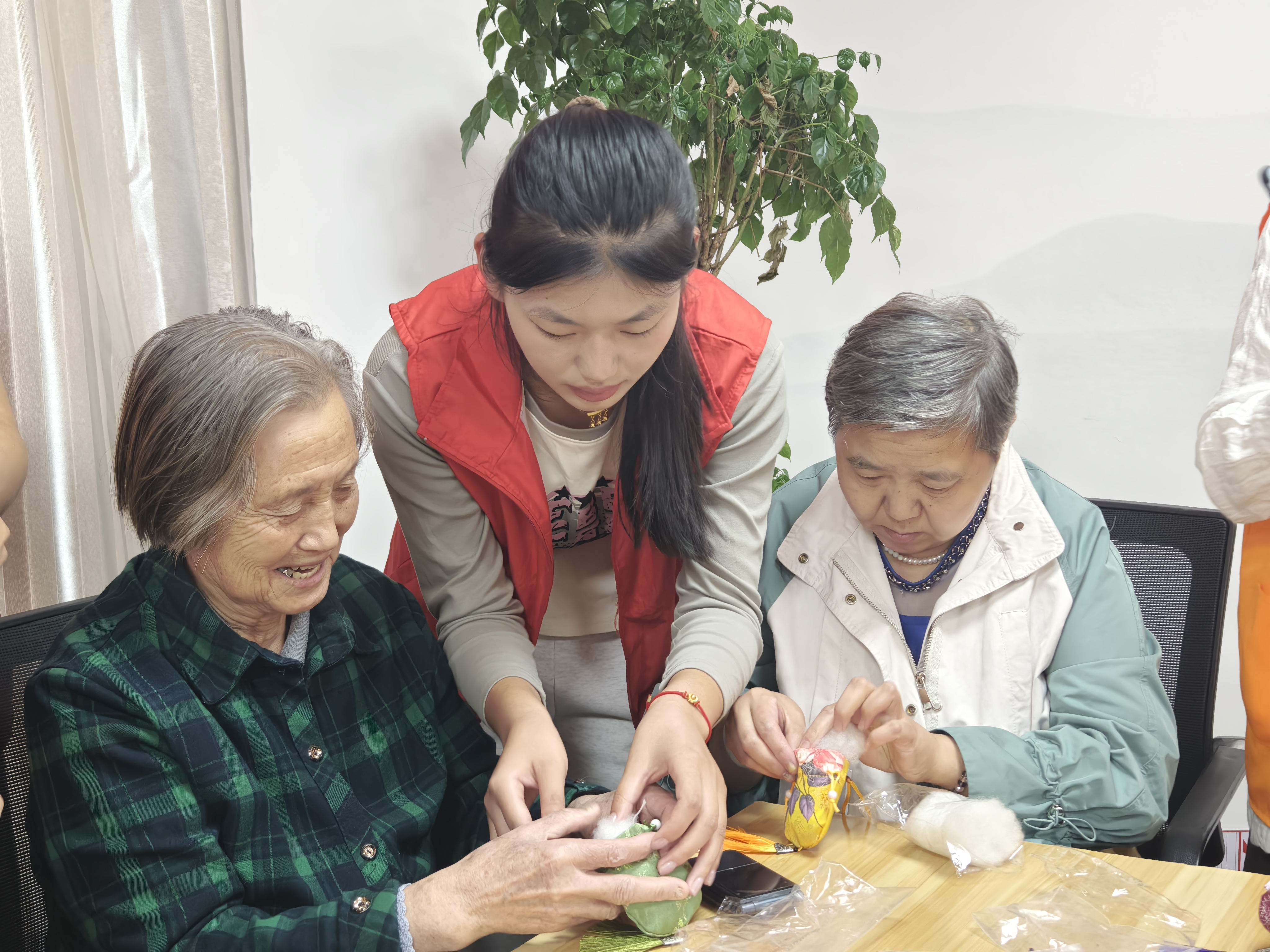 志愿者们还与老人们一同动手制作了艾草香囊。在志愿者的耐心指导下,老人们兴致勃勃地挑选材料、穿针引线、缝制香囊,现场气氛温馨而欢乐。香囊虽小,却承载着志愿者们对老人们的深深祝福与敬意。